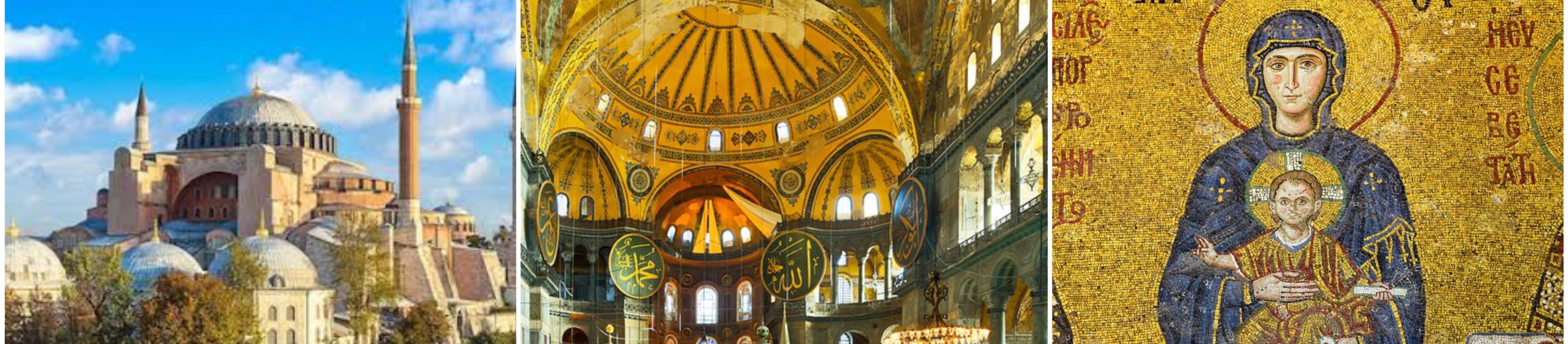 (Image Pictures) Left: Hagia Sophia, Middle: Interior of Hagia Sophia, Right: Mosaic at Hagia Sophia