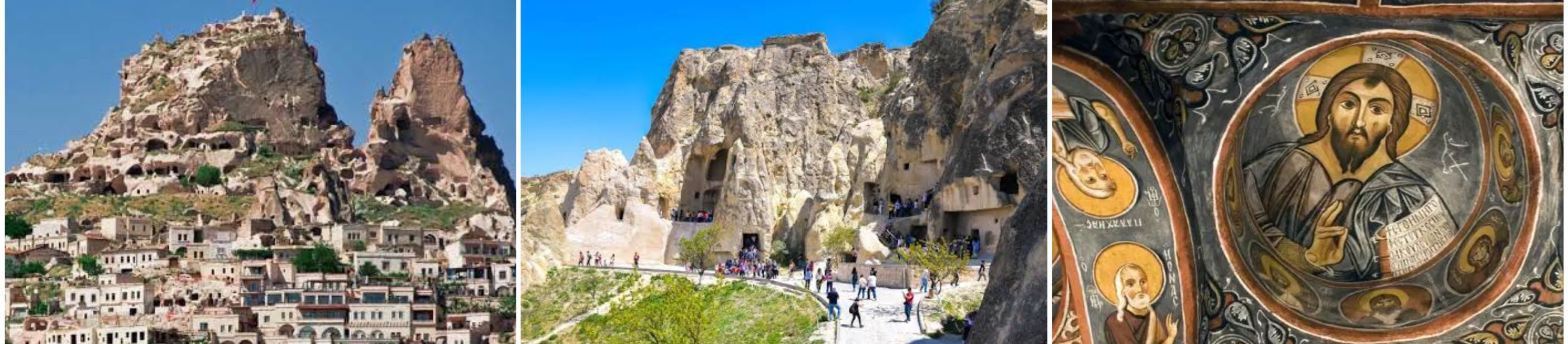 (Image Pictures) Left: Uchisar Castle, Middle: Open Air Museum, Right: Fresco in Dark Church at Open Air Museum / with an extra entrance fee