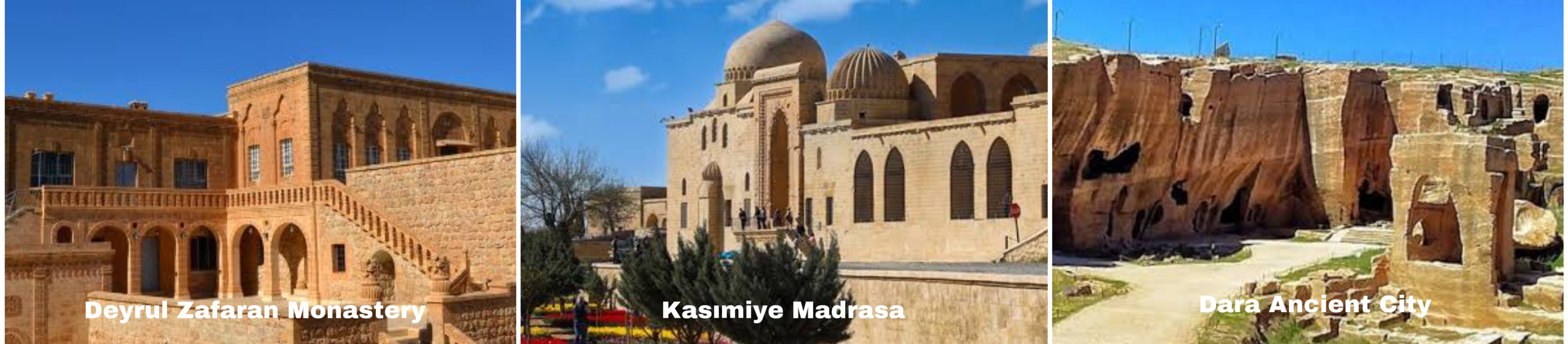 Please do not forget, Mardin is a town full of history from Msopopotamia ages. There are many historical buildings related to their religions and cultures. Deyrul Zafaran Monastery, Kasımiye Madrasa, Mor Gabriel Monastery and Grand Mosque are worthly of special mention. Dara Ancient City is known as the most important frontier fortress of Rome, and the ruins of churches, palace, bazaar, amoury and water dam can still be seen in the city.