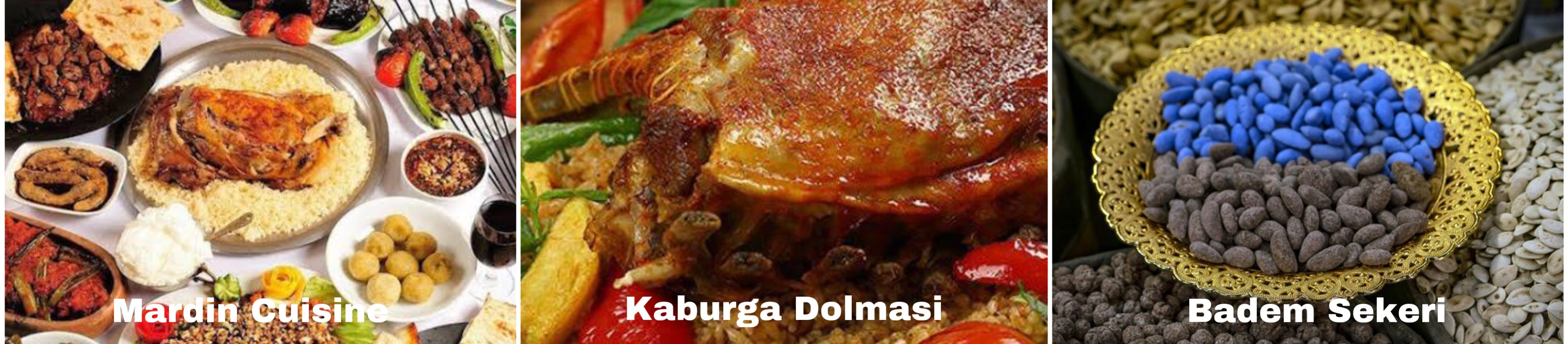 Mardin cuisine is very colorful just like their culture. Here is the place gathering people of many races, religious, languages and cultures. So there are many unique flavors which have been reflected many features of their culture since Mesopotamian era. In face, most of their recipes cannot be imitated in many parts of Turkey and only the local people can make special tastes of dishes. Furthermore, 7 products of Mardin’s cuisine are registered with geographical indications and loved by Turkish people, which are Badem Sekeri (almond candy), sembusek (Stuffed savory pastry), Kaburga dolmasi (stuffed ribs), mumbar dolmasi (stuffed sheep sausages), kilice coregi (pastries with a variety of spices), bulguru, and Ikbebet (boiled stuffed meatballs). Meat dishes are served on silver or copper trays so that you can enjoy not only their taste but also visually. Here is some pictures to stimilate your appatite.
